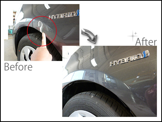 10円玉くらいの大きさで塗装が剥がれてない凹みの場合、塗装面はそのままで修復します。しかも、短時間(30分から1時間)で低価格(板金塗装の3分の1)です。